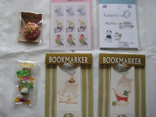 かいななえさんの新作・にゃんこの栞、ぶらんのわ~るさんのマグネットと小鳥シール、紫さんの「かたじけさんメモ帳」。
