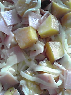 おかずは南瓜の煮物、ちくわ・チーズ・カニカマの梅肉和え、ジャガイモとピーマンの炒めもの。
