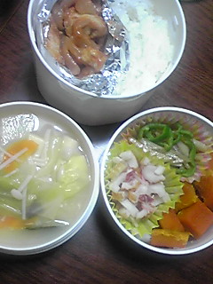 南瓜の煮物、ハッシュドポテトのベーコン巻き(冷食で手抜き^^;)、もやし・ニンジン・ピーマンの炒めもの。